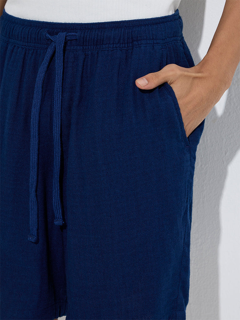 These indigo shorts from ETA are tailored in a relaxed frame for everyday ease. Crafted from a rich cotton-blend fabric, they feature a mid-rise silhouette, smooth elastic waistband with adjustable drawstrings, and multiple pockets for added functionality and style.