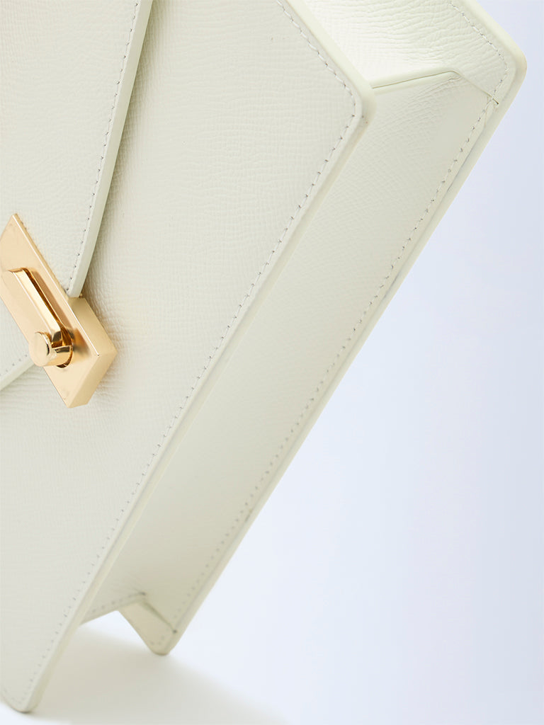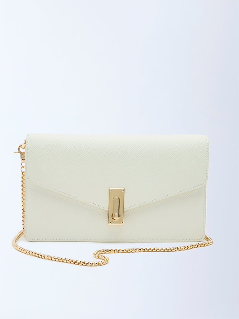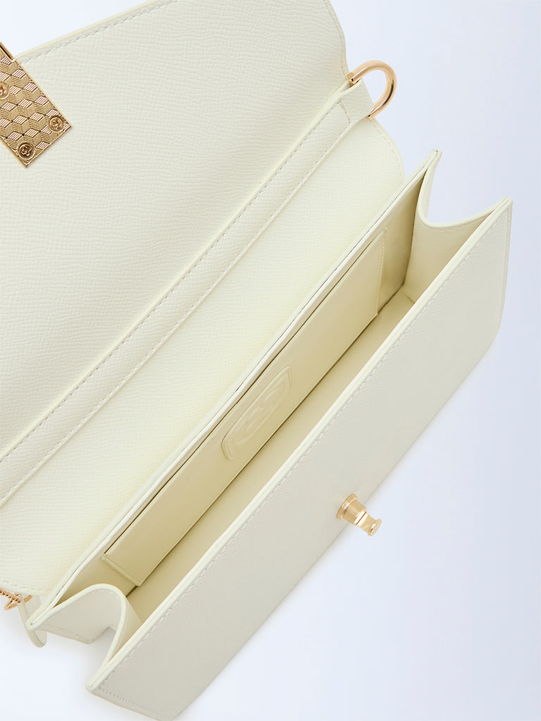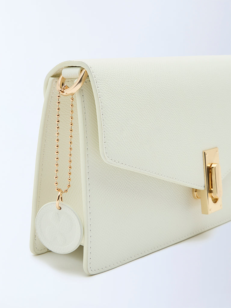 Accented with gold-tone detailing and a signature turn-lock closure, it features a chain strap for versatile styling.