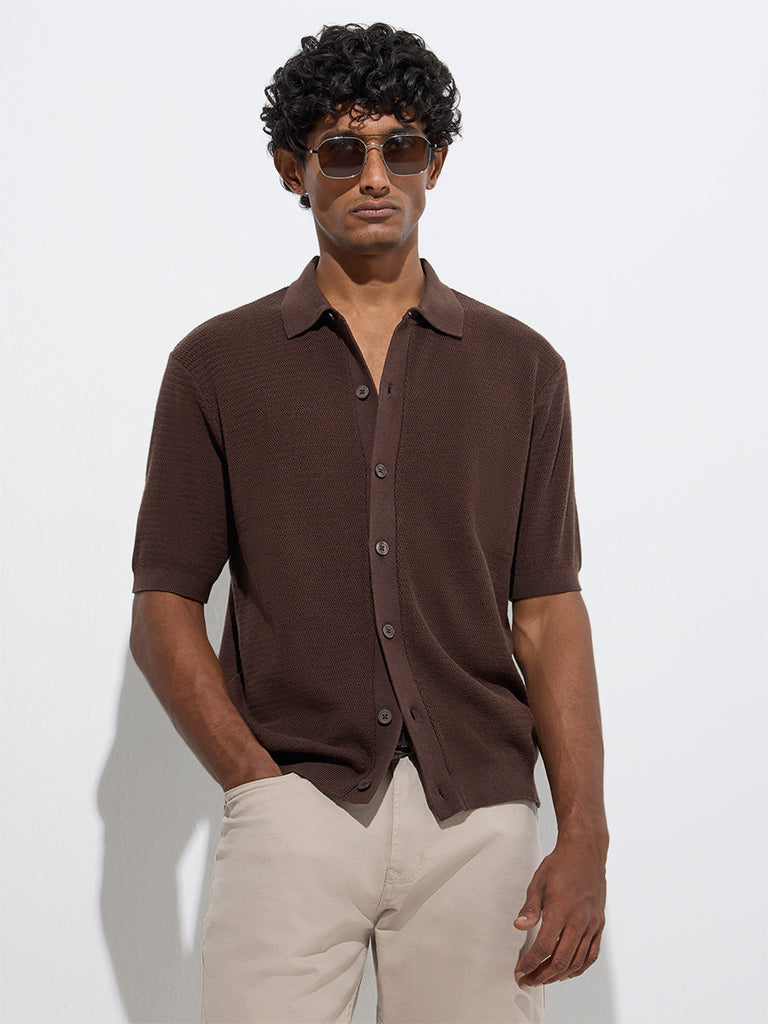 Earthy and refined, this brown shirt from Ascot brings depth to your everyday essentials with its subtle knit-textured weave. Created from a sumptuous cotton-blend fabric in a relaxed handle, it features a spread collar, a button placket, and half sleeves.