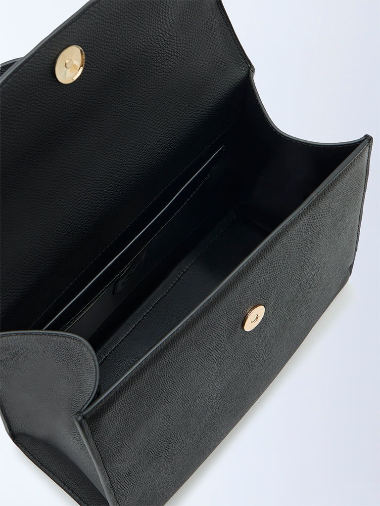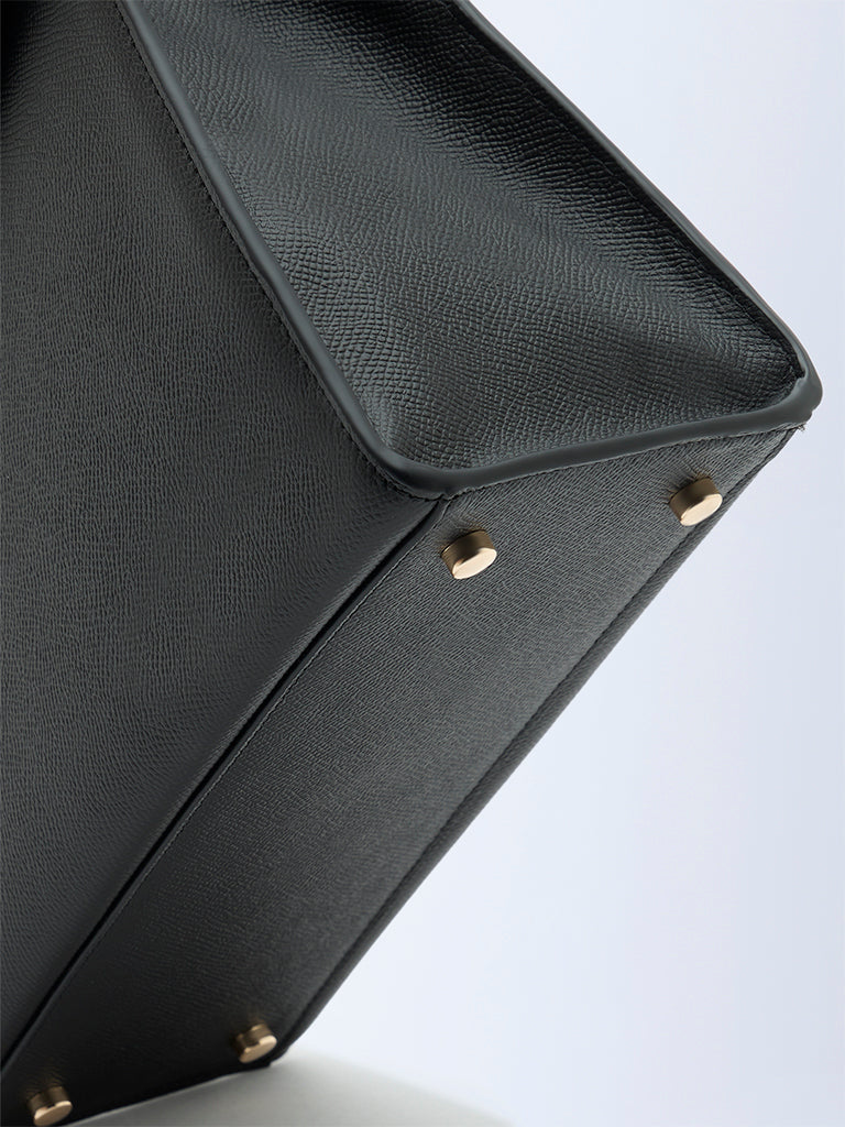 Crafted from finest leather, it features a structured top handle, a signature push-lock closure, and a detachable strap for effortless crossbody wear.