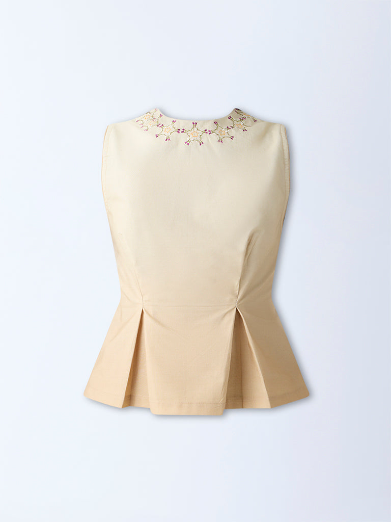 Amp up your off-duty style with this beige top from Bombay Paisley, adorned with vivid floral embroidery on a peplum silhouette. Woven from cotton-rich fabric, it features a round neck, sleeveless cut, and a back zipper closure for easy wear.