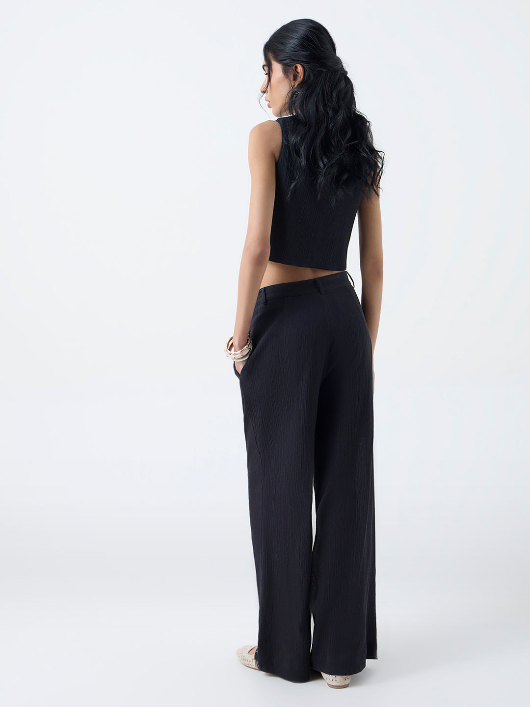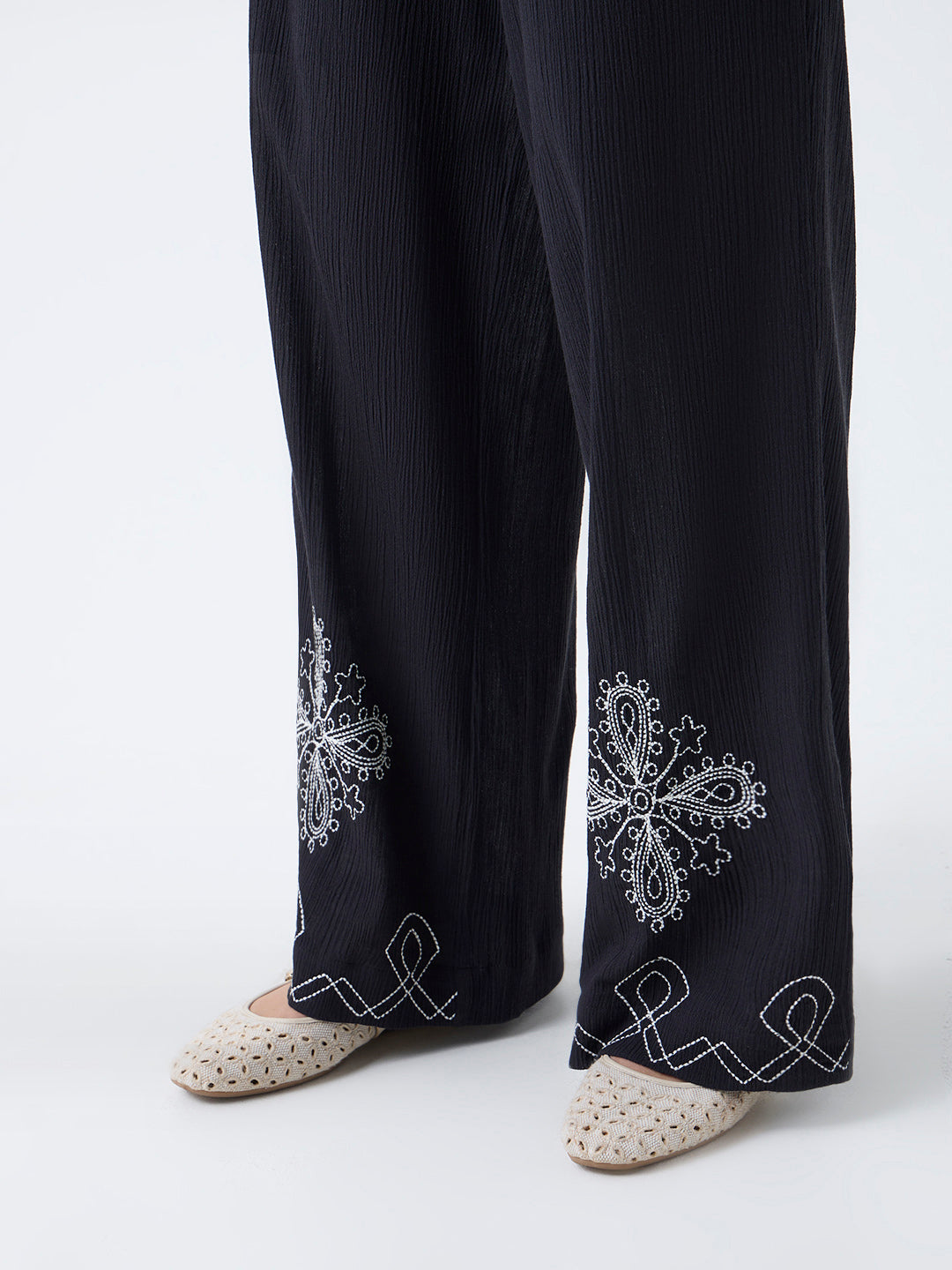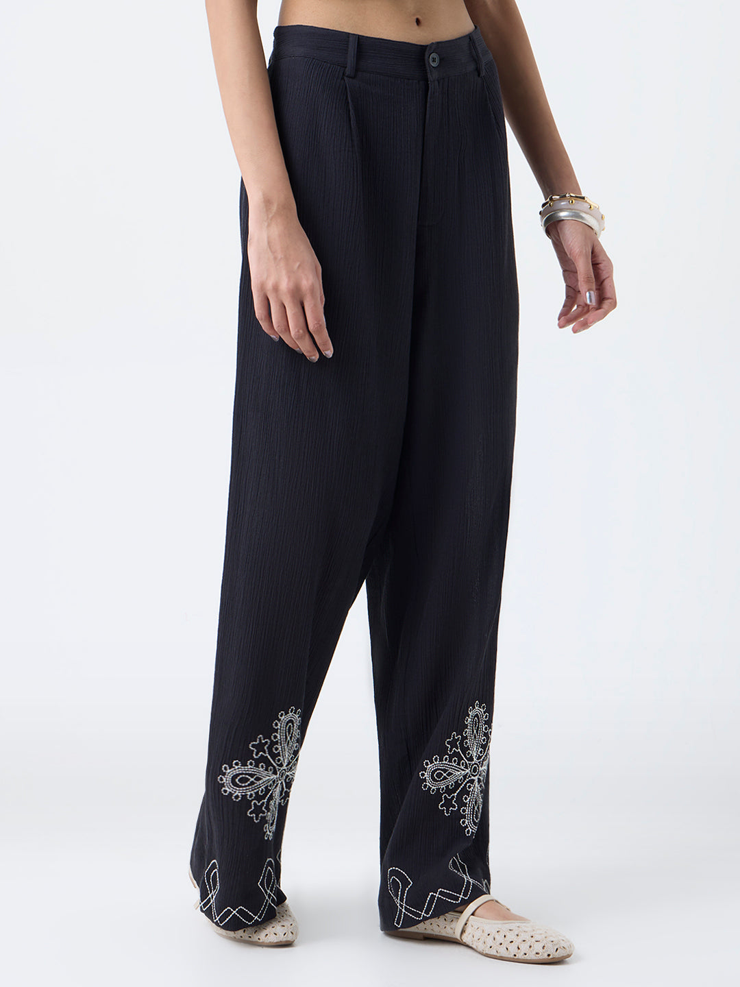 Bombay Paisley elevates everyday dressing with these black crinkle-textured pants, enriched with delicate floral embroidery tracing the hemline. Crafted from pure cotton for breathable ease, they feature a classic button-and-zip closure, belt loops and practical side pockets for day-to-day functionality.