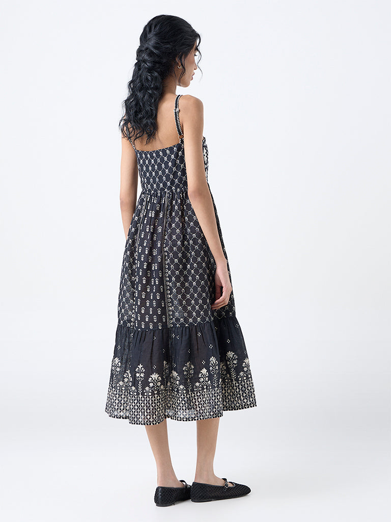 Bombay Paisley Black Embroidered Cotton Tiered Dress