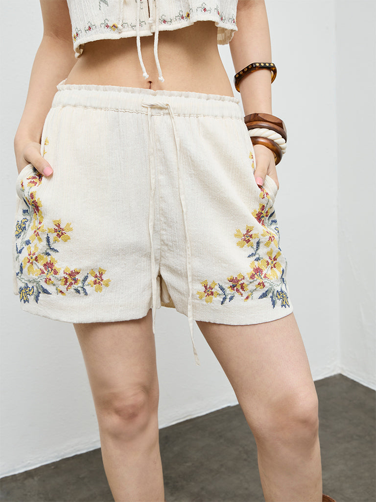 Bombay Paisley Off-White Floral Embroidered Cotton Shorts