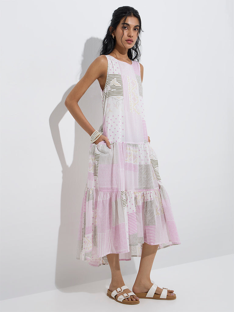 This white dress from Bombay Paisley is spun from pure cotton in a drop-waist silhouette for a flattering fit. Showcasing a varied mix of prints, it features a round neck and a sleeveless cut, making it an easy-going choice for warm-weather days.