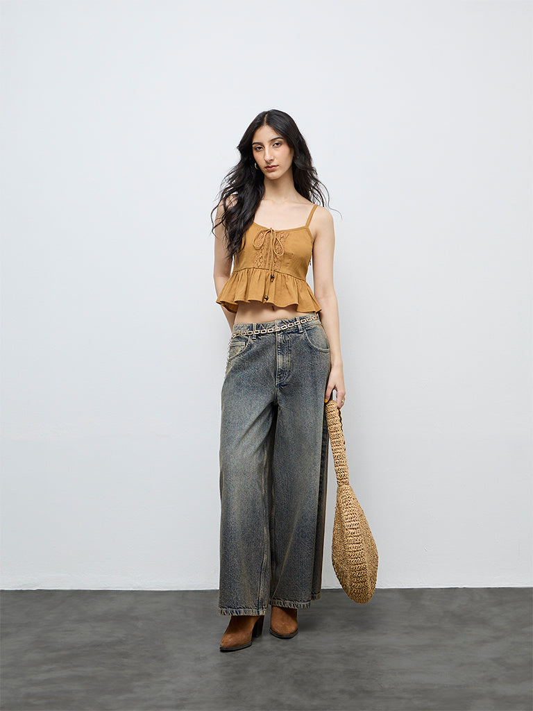 Bombay Paisley brings a relaxed update to everyday styling with this yellow top. The peplum silhouette adds gentle volume at the hem, while lace detailing along the bodice draws focus to the front. A V-neck with tie-up details offers adjustable ease, complemented by adjustable shoulder straps for a clean finish. Crafted from breathable cotton fabric, the style remains comfortable for warm days and casual pairings.