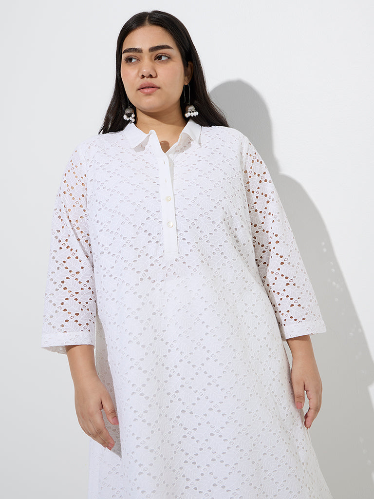 Diza White Schiffli Embroidered A-Line Cotton Kurta