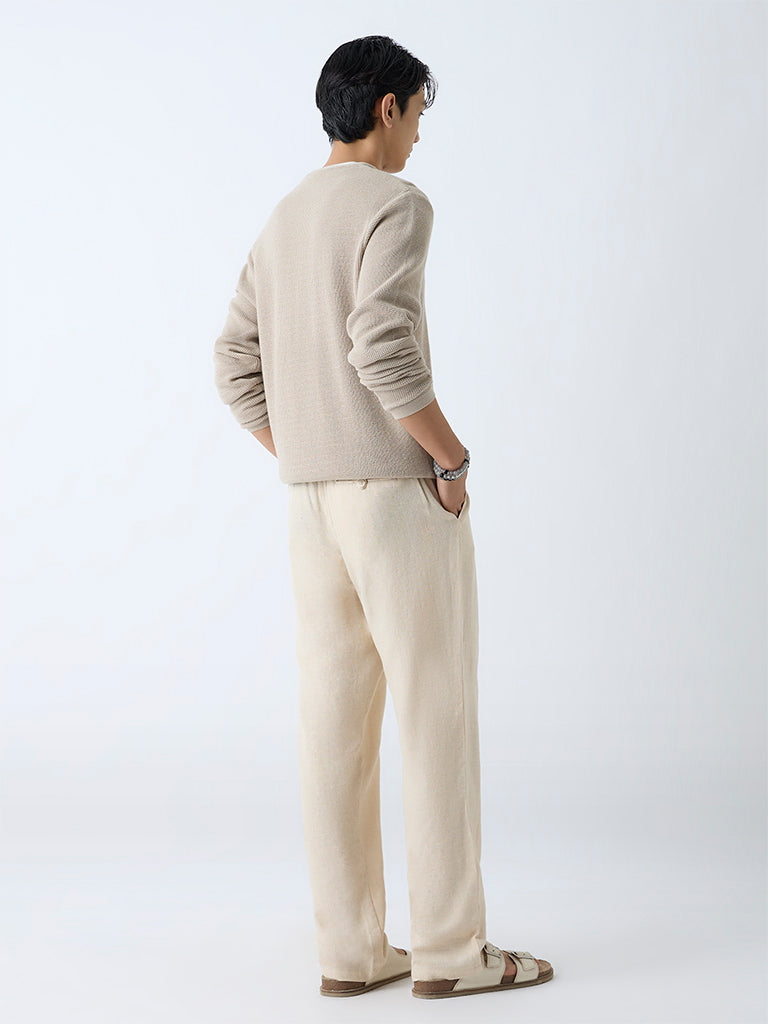 Bring sophisticated charm to your daytime assortment with these beige chinos from ETA. Cut in a relaxed fit, they feature a buttoned waistband with adjustable drawstrings, a zipper fly, and belt loops for a comfortable finish. Multiple pockets enhance functionality, while the soft cotton-blend fabric ensures all-day ease.