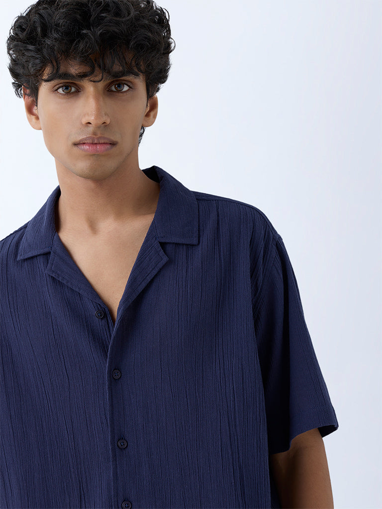 ETA Navy Crinkle-Texture Relaxed-Fit Cotton Shirt