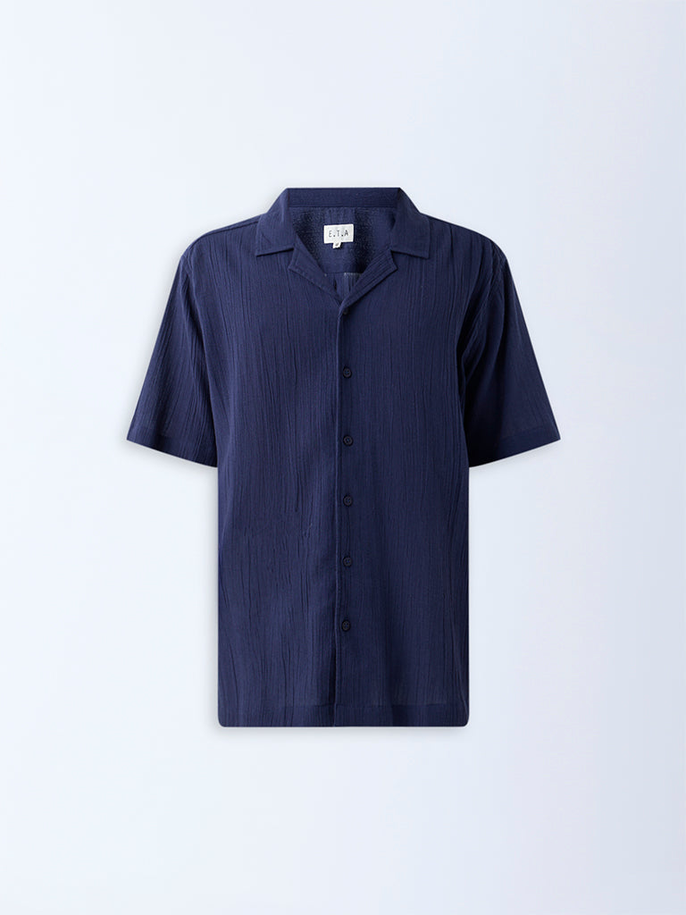 This navy shirt from ETA is tailored in a relaxed fit and crafted from pure cotton with a crinkle-textured finish that adds quiet dimension. Framed with a camp collar, half sleeves, and a clean button placket, it’s a refined essential built for easy transitions between casual and elevated settings.