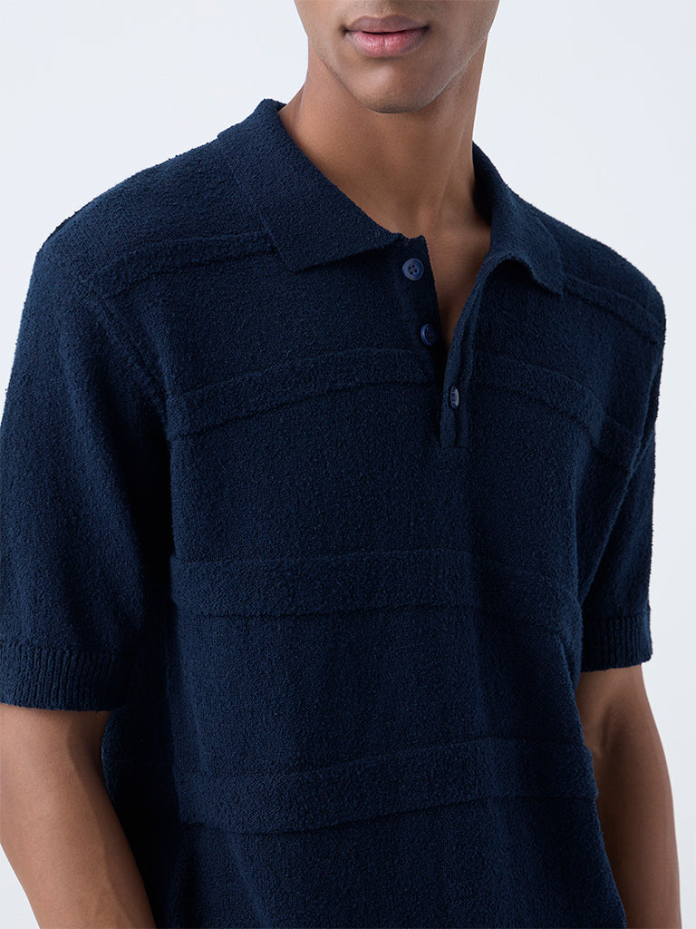 ETA Navy Self-Striped Relaxed-Fit Cotton Polo T-Shirt