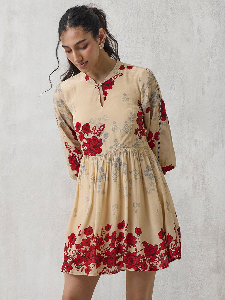 Brighten up your everyday collection with this beige mini dress crafted from a lightweight fabric for added comfort. This A-line dress is fashioned with a notched collar and button-fastening, three quarter sleeves as well as floral motifs all over for a feminine touch. It styles well with block heels and minimalistic jewellery for a chic outfit.