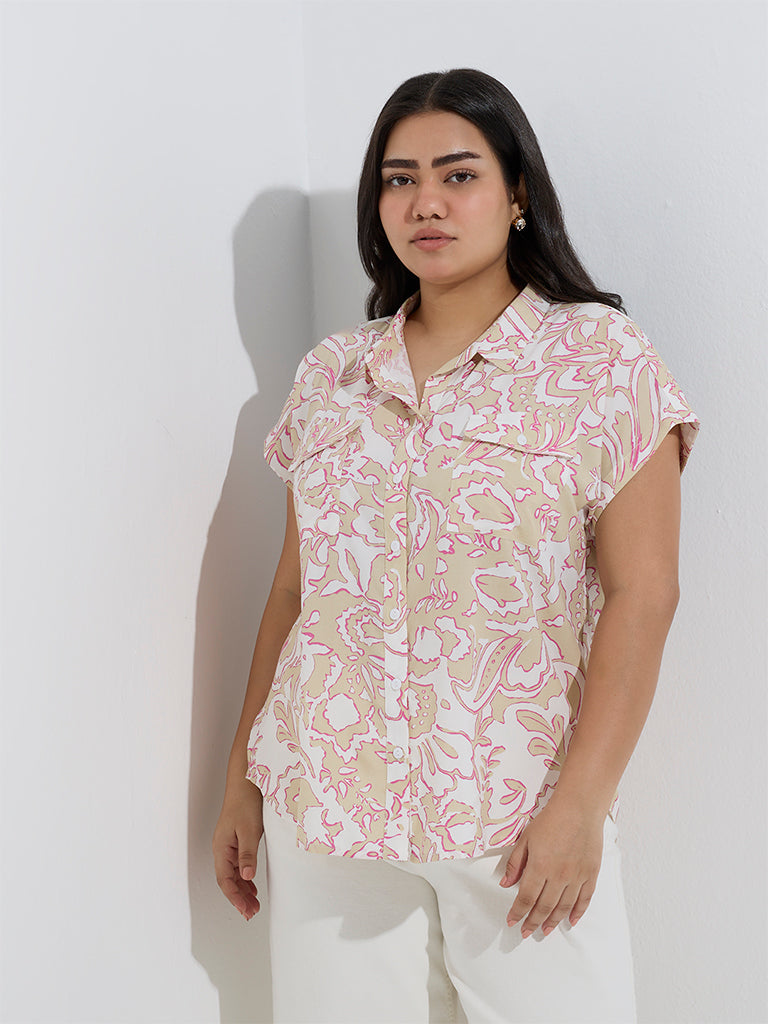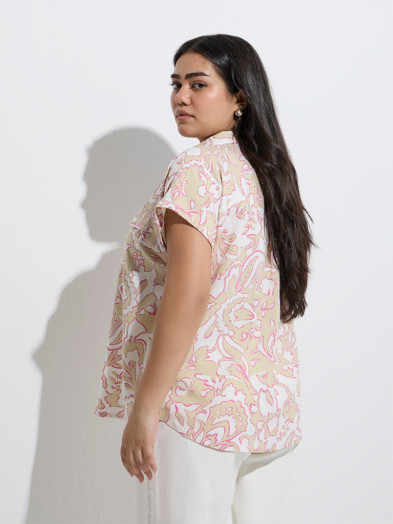 This beige shirt from Gia is woven from a breathable fabric and adorned with abstract motifs throughout. Featuring a collar that extends into a button placket, relaxed dolman sleeves, and two imitation patch pockets, it balances comfort with understated style.