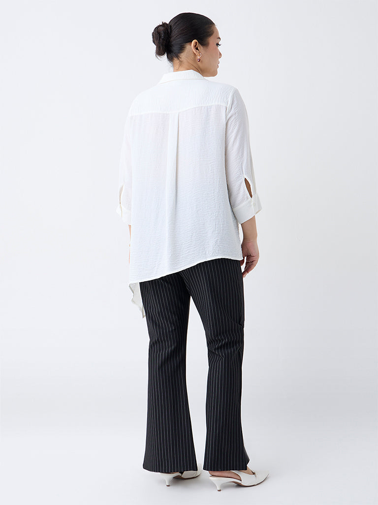 Ideal for dressier outings and evenings that demand understated elegance, these black bootcut trousers by Gia are tailored with fine pinstripes that elongate your frame. Made from a stretch-infused fabric and fitted with an elasticated waistband, they balance structure with comfort. The slit detailing at the hem adds a contemporary, flattering flourish—perfect for heels or sleek flats.