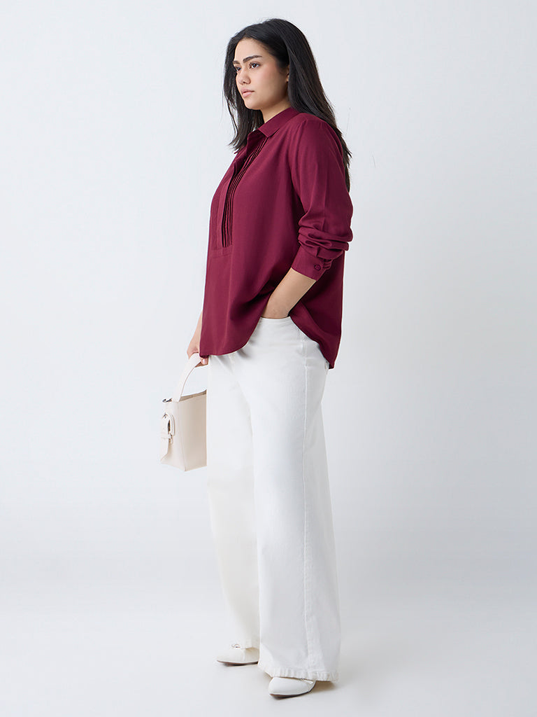 Stay cool and confident in this burgundy blouse from Gia. Crafted from breathable fabric, it feels light against the skin perfect for warm summer days. Pintuck detailing adds texture through the front, while the collar, concealed button placket and full sleeves keep the silhouette clean and structured.