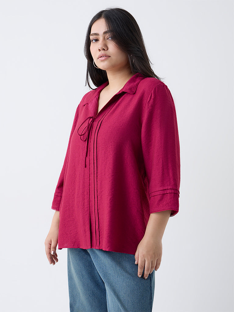 Enhance your everyday elegance with this magenta blouse from Gia. Crafted in a premium fabric, it stands out with a soft collar detailed with adjustable drawstrings and delicately placed pintucks that add graceful structure. The three-quarter sleeves give it a feminine finish.