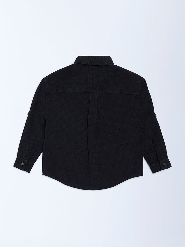 Composed and versatile at the same time, this black shirt from HOP Kids lends a clean, all-round appeal to their look. Designed with a classic collar, buttoned placket and full sleeves, it is finished with a chest pocket that adds a touch of utility. It is made from pure cotton, ensuring softness and comfort for everyday wear.