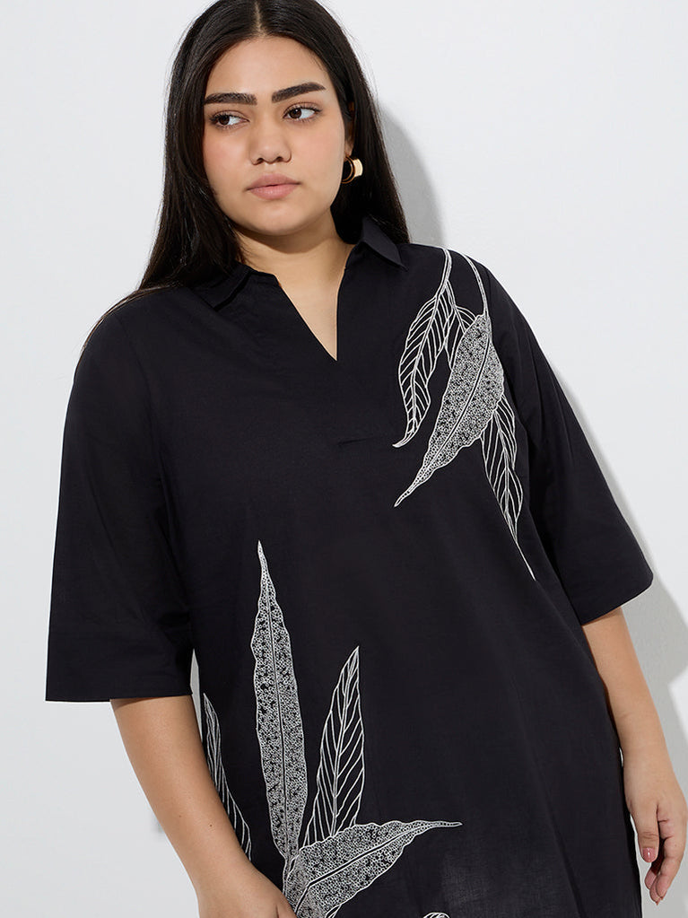 Diza Black Leaf Embroidered Cotton Kurti