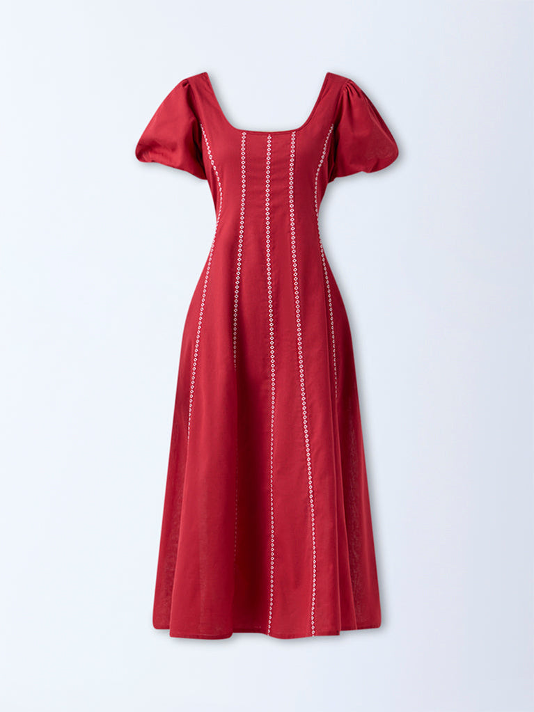This red dress from Bombay Paisley showcases embroidered stripes across a flattering A-line silhouette. Crafted from a soft cotton-blend fabric, it features a scoop neckline, puff sleeves, and a back zipper for easy dressing. A chic piece that transitions effortlessly from casual outings to weekend gatherings.