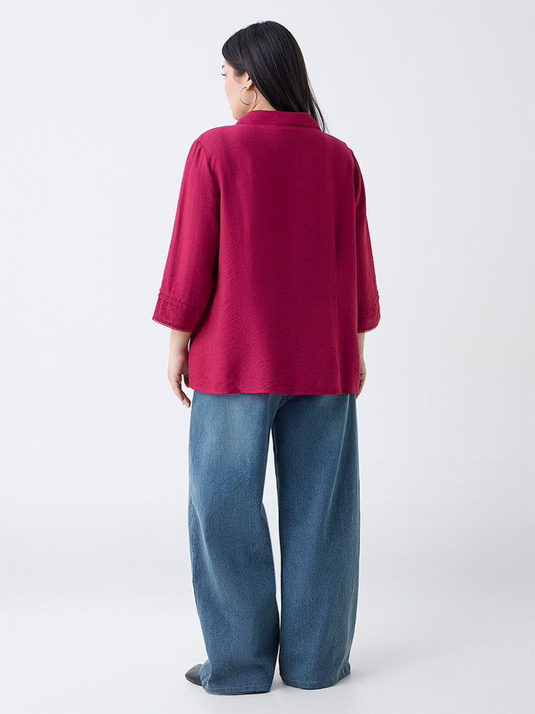 Enhance your everyday elegance with this magenta blouse from Gia. Crafted in a premium fabric, it stands out with a soft collar detailed with adjustable drawstrings and delicately placed pintucks that add graceful structure. The three-quarter sleeves give it a feminine finish.