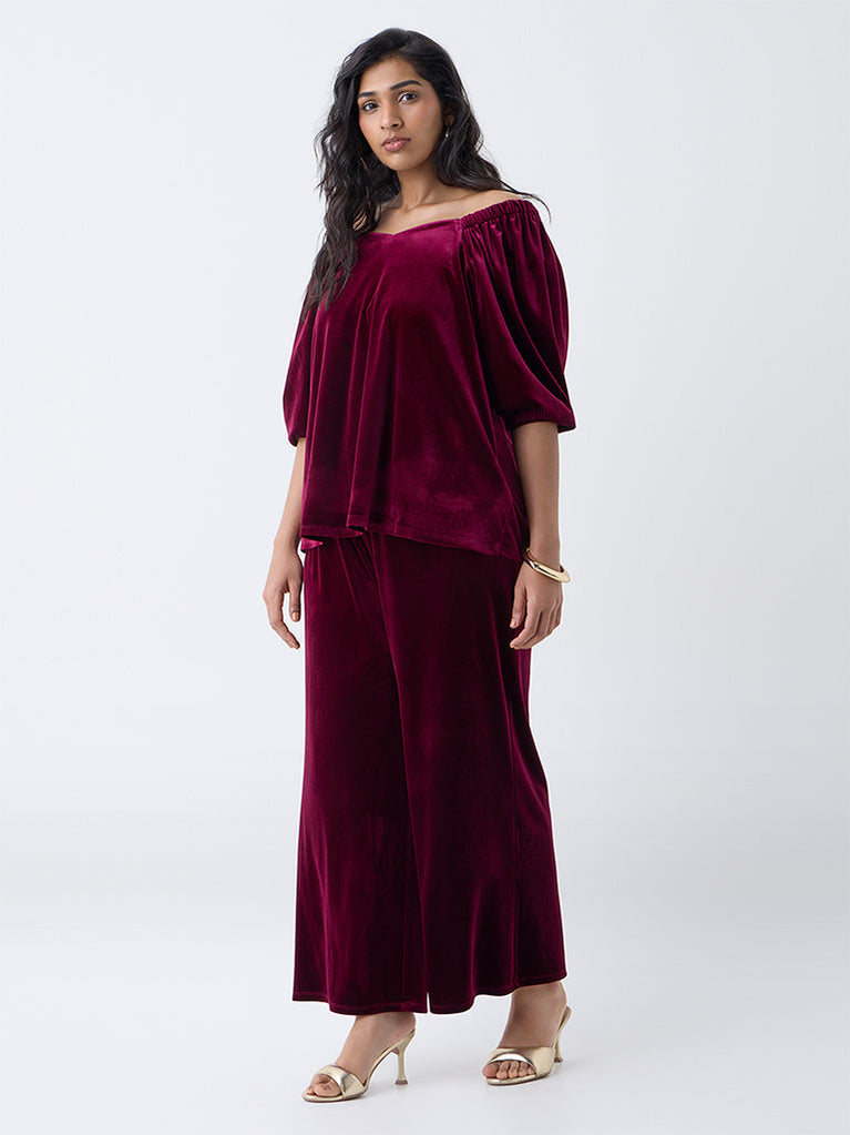 Rich and alluring, this maroon velvet top from Gia features a flattering off-shoulder neckline and blouson sleeves. The plush texture and fluid drape make it an effortless statement for evenings that call for easy glamour.
