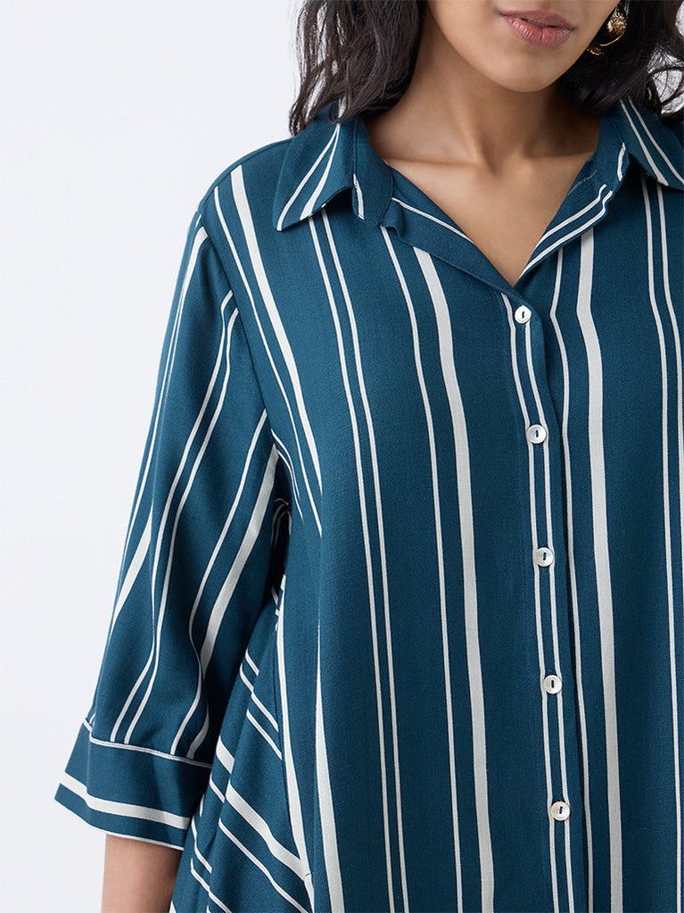 This teal striped blouse from Gia reimagines everyday ease with a stylish twist. Tailored from a breathable fabric, it features an asymmetrical hemline with button slits and three-quarter sleeves. Designed in a relaxed fit, it pairs beautifully with trousers or jeans for a polished yet easy-going look.