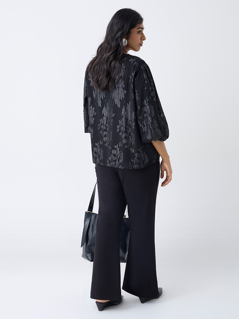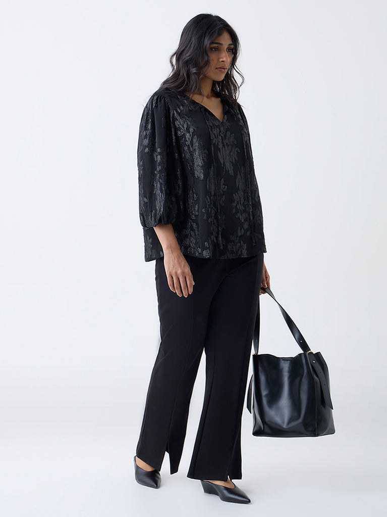 Add a hint of shimmer to your everyday wardrobe with this black top from Gia. Showcasing metallic floral designs, it’s crafted from lightweight fabric that drapes effortlessly. Designed with a V-neck with drawstring details and peasant sleeves, it’s a refined option for both day and evening occasions.