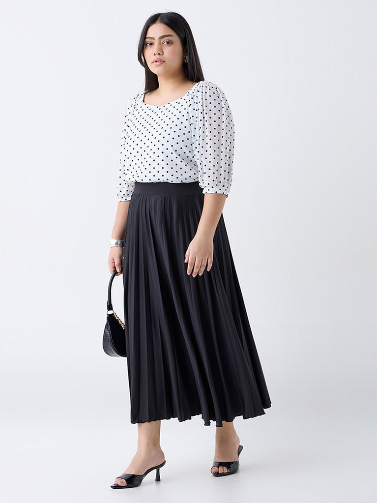 This white top from Gia showcases a playful polka dot print in a contrasting hue for a chic, feminine touch. Designed with a flattering pentagon neckline and blouson sleeves, it strikes the perfect balance between elegance and ease.