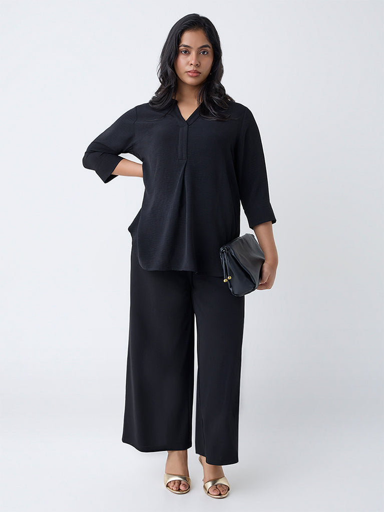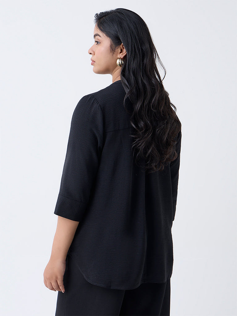 Thoughtfully designed for feminine dressing, this black blouse by Gia features delicate pintuck detailing that enhances structure while complementing curves. Crafted from a sumptuous fabric, it is finished with a collar, concealed button placket and full sleeves with buttoned cuffs—making it an elegant choice for office hours, evening outings or dressed-up weekends.