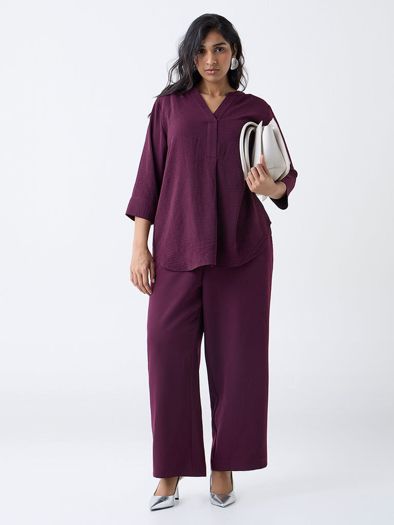 This wine top from Gia is crafted from a breathable fabric with a crinkle-texture for subtle depth. It features a V-neck, three-quarter sleeves and a relaxed fit for easy movement. A versatile piece that blends comfort with understated sophistication.