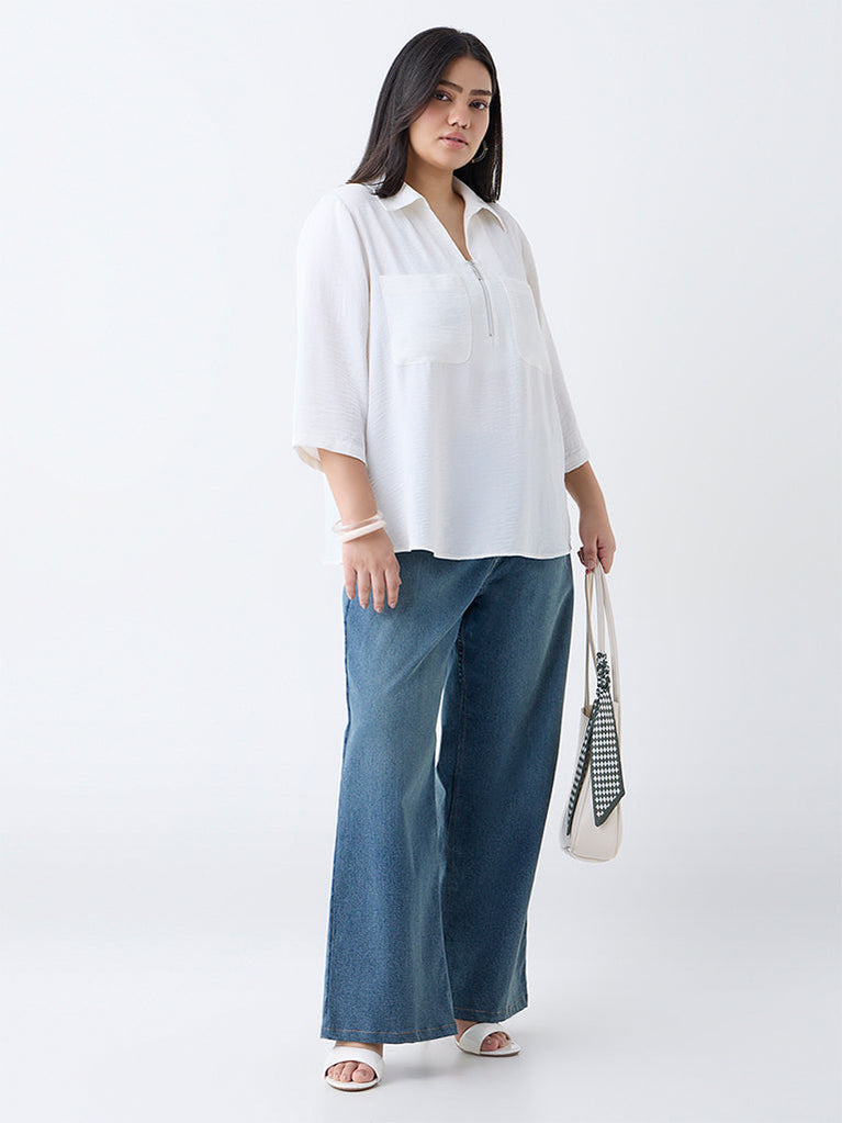 This white blouse from Gia combines relaxed texture with refined ease. Designed with a crisp collar and zipper front, it features 3/4th sleeves and dual chest pockets for added functionality. Perfect for smart-casual styling through the week.