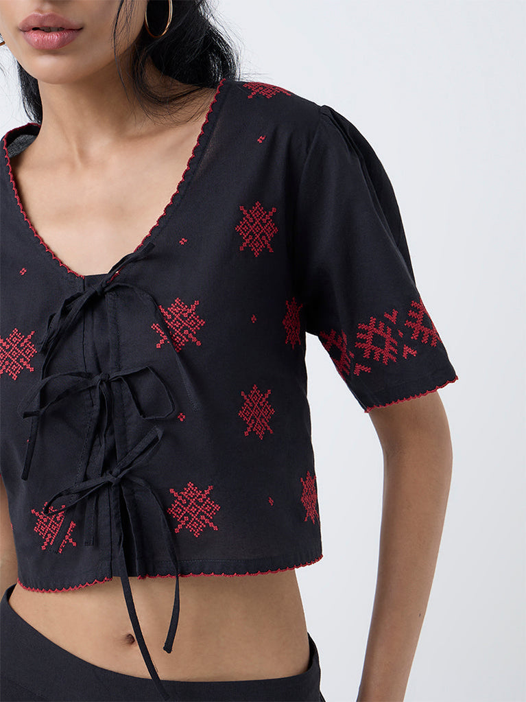 If you love pieces that feel handcrafted and unique, this embroidered black top by Bombay Paisley is a wardrobe favourite waiting to happen. The cross-stitch motifs add artisanal detail, and the scalloped deep V-neckline offers a feminine touch. A front tie-up enhances the boho aesthetic, while the pure cotton base keeps the fit light and breathable.
