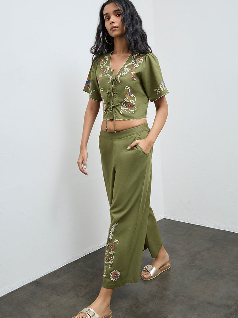 Bombay Paisley Green Floral Embroidered Cotton-Blend Top