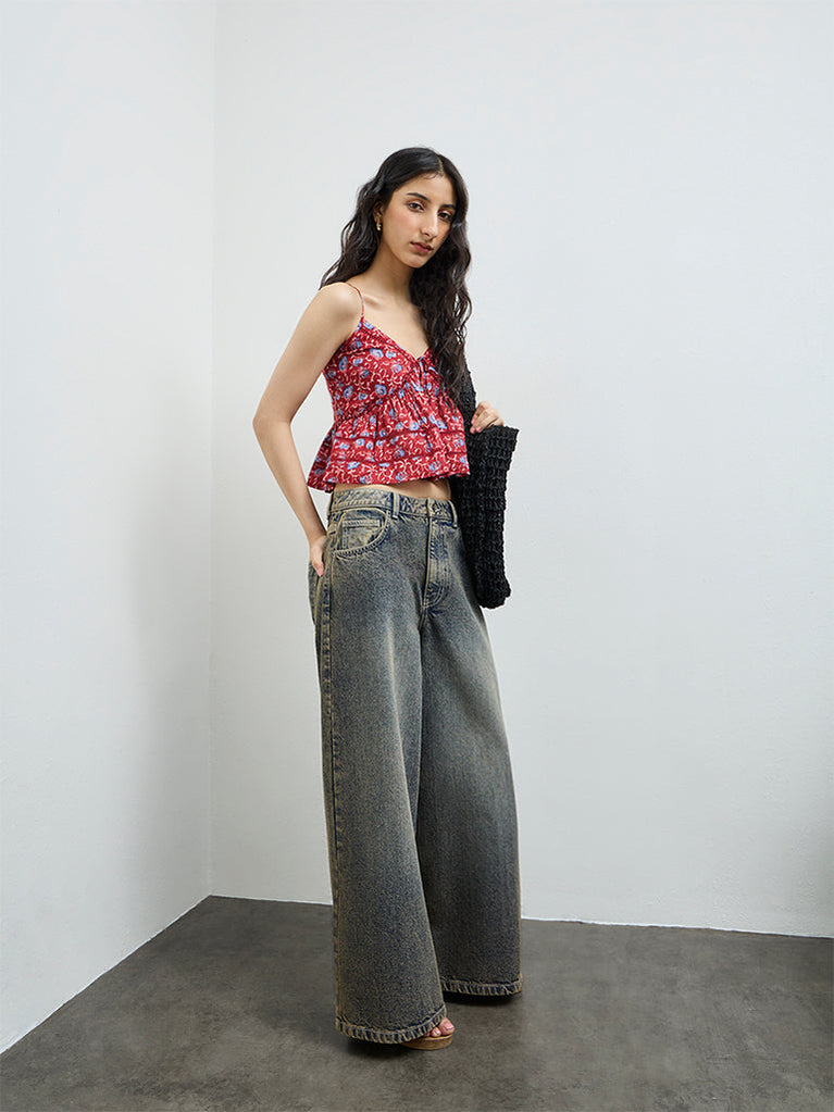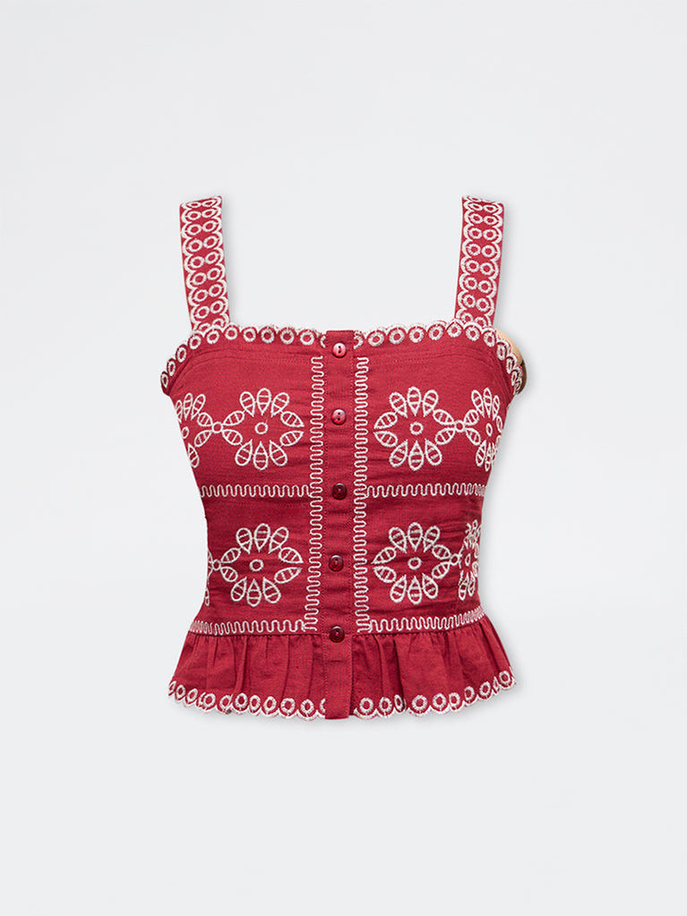 Bombay Paisley introduces this red top featuring vivid embroidery for an eye-catching charm. It is framed with a square-neck, thick shoulder straps, a button-up front and a slightly ruffled hem for playful detail. Milled from a cotton-blend fabric, it is suitable for long-wear hours and warm-weather outings.
