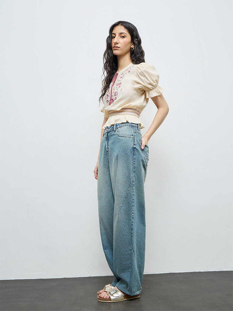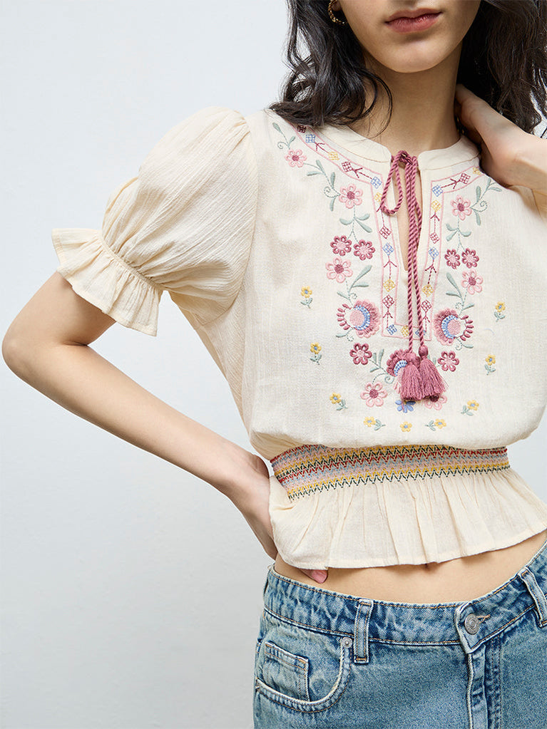 Bombay Paisley Off-White Floral Embroidered Smocked Cotton Top
