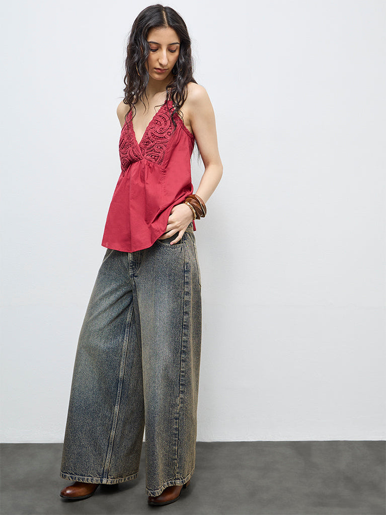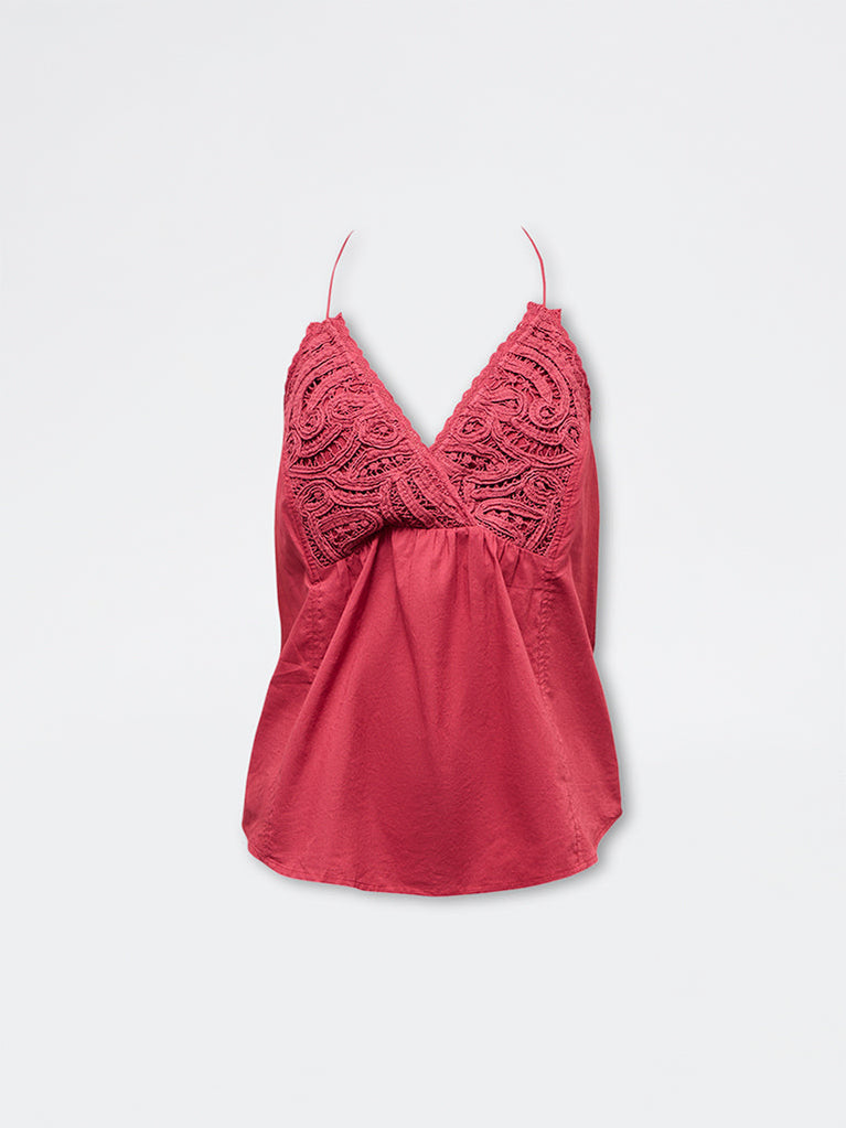 Bombay Paisley presents this red sleeveless top designed with intricate crochet detailing at the bust. An overlapping V shape is framed by a halter neckline, secured with tie string detailing at the back. Subtle pleating under the bust creates a soft flare, lending the piece a light, summer ready silhouette with a chic, feminine finish.