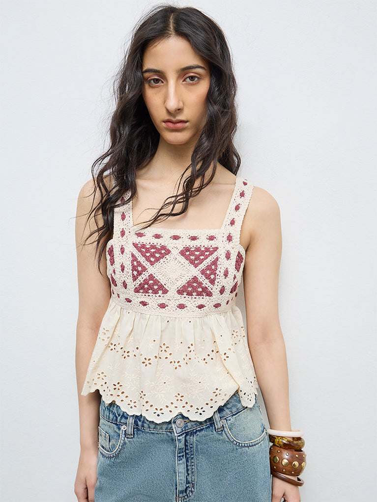 Bombay Paisley presents this off-white crochet top designed with a square neckline and slender shoulder straps. The sleeveless silhouette features a frilled cotton bodice detailed with cut-out embroidery. Finished with a scalloped hemline, the piece blends texture and delicate construction, creating an artisanal aesthetic with a soft, feminine appeal.