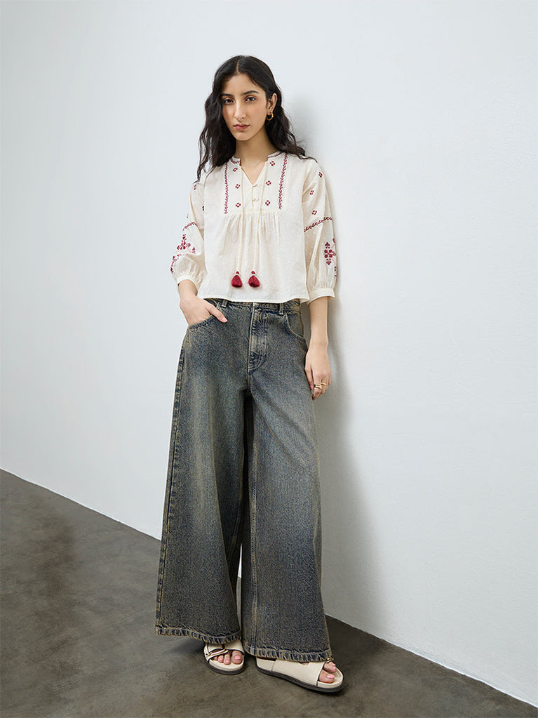 Bombay Paisley Off-White Floral Embroidered Cotton Top
