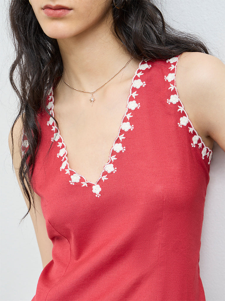 This red top from Bombay Paisley is crafted from a breathable cotton-blend fabric for all-day comfort. A deep V-neckline is highlighted with floral embroidery, adding richness and artisanal detail.