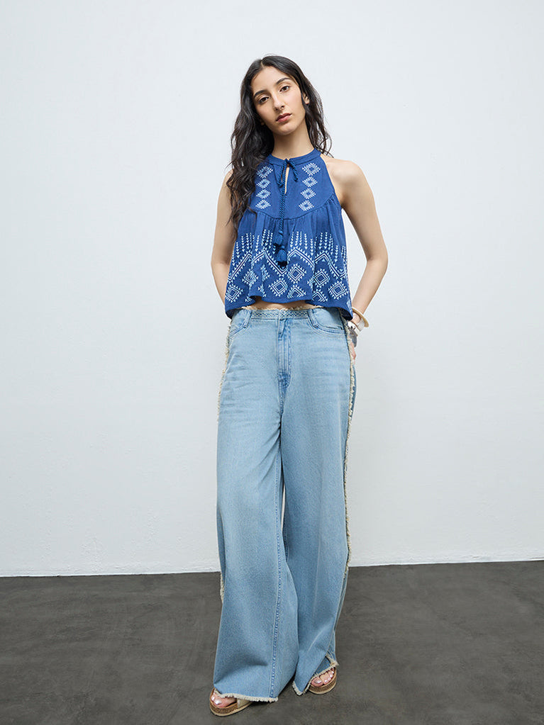 Bombay Paisley presents this blue embroidered top crafted from pure cotton for breathable comfort. Designed with a sleeveless silhouette, it features a split neckline finished with tie-up drawstrings. Intricate embroidery adds a handcrafted touch, making it ideal for relaxed, warm-weather dressing.
