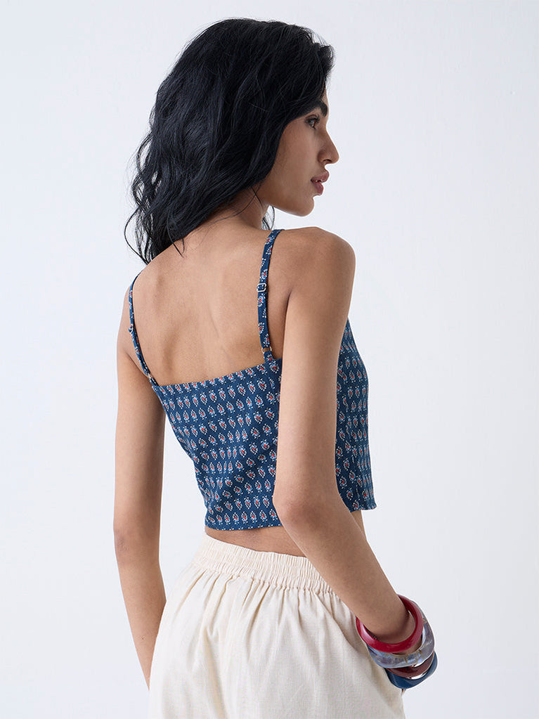 Soft, easy charm shapes this blue top by Bombay Paisley, highlighted by compact all-over motifs that add a crafted touch. The sleeveless silhouette features adjustable straps and a sweetheart neckline that enhances the airy frame. Woven from a cotton-rich fabric for day-long comfort, it suits warm-weather outings, casual pairings and relaxed weekend hours.