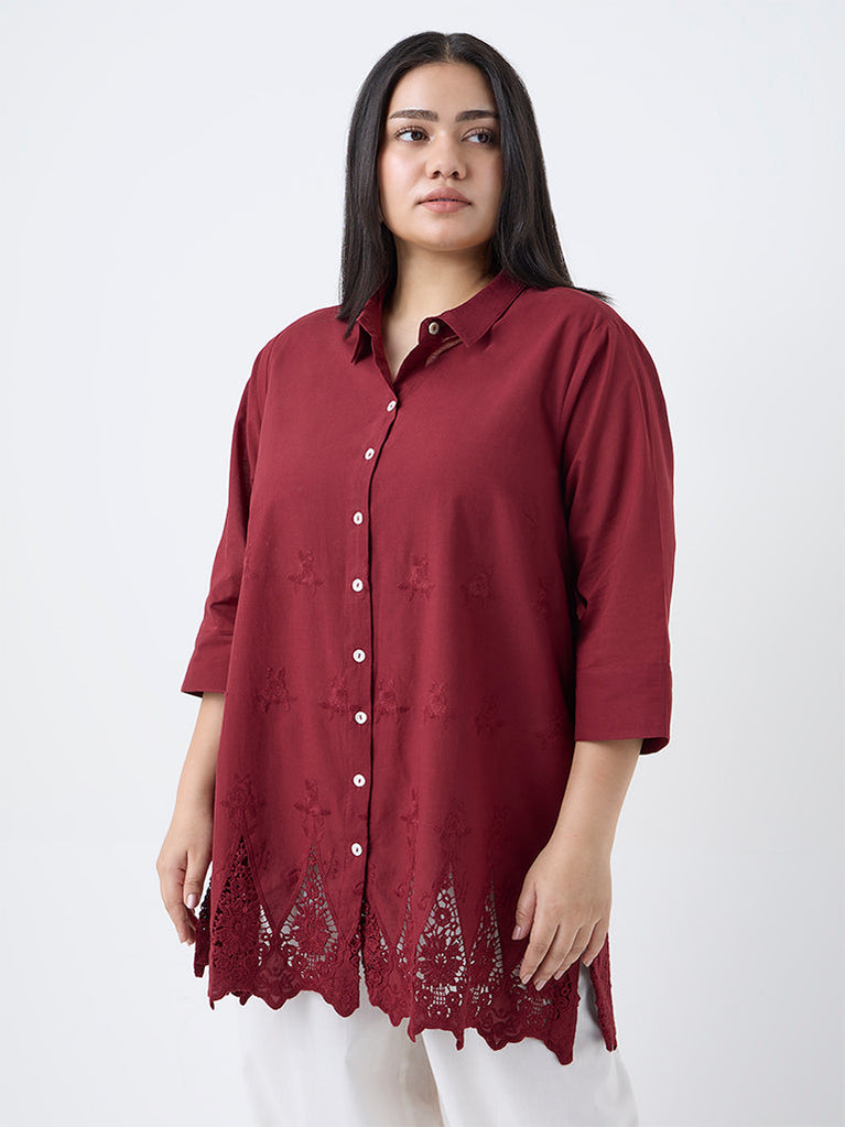 Diza presents this red ethnic tunic, exuding artisanal charm with intricate floral embroidery and delicate lace accents. Crafted from breathable cotton, it offers all-day comfort while maintaining a refined silhouette. Featuring a classic collar, button-up front, and three-quarter sleeves, it pairs beautifully with skirts, pants, or layered ethnic ensembles.