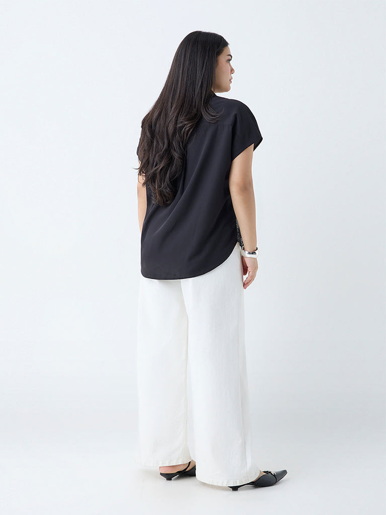 This black shirt from ETA stands out with artful embroidered panels that bring a crafted edge to its minimalist design. Cut from a breezy fabric in a relaxed silhouette, it features a semi-spread collar, a button placket, and short sleeves, making it a refined choice for everyday wear.