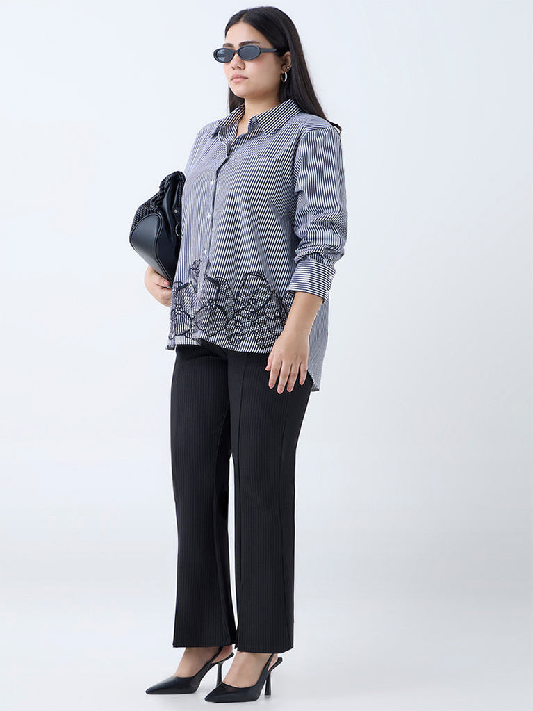 Gia gives classic stripes a chic update with this black shirt, highlighting floral embroidery along the hem for a feminine finish. Designed with a structured collar, button placket, full sleeves and a chest pocket, it’s a versatile piece that moves effortlessly from desk to dinner.