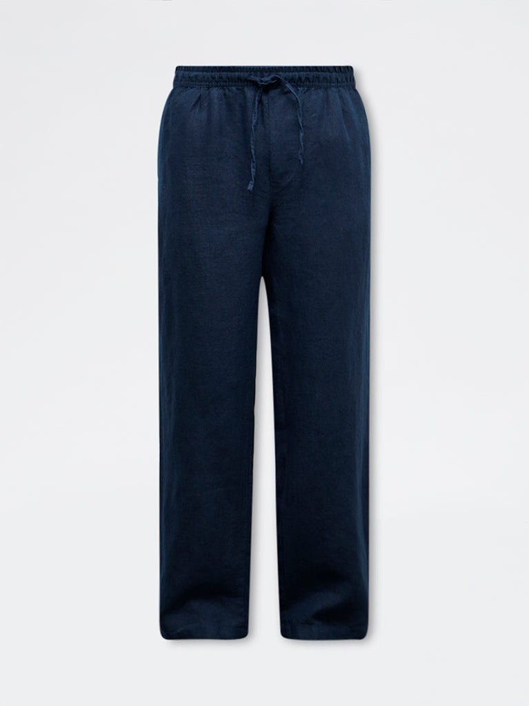 Ascot introduces these indigo chinos crafted from a sumptuous linen fabric and shaped in a relaxed fit for effortless wear. Designed in a mid-rise waist, they feature an elasticated waistband with adjustable drawstrings for comfort. Multiple pockets add everyday practicality, making them suitable for workdays and more formal settings.