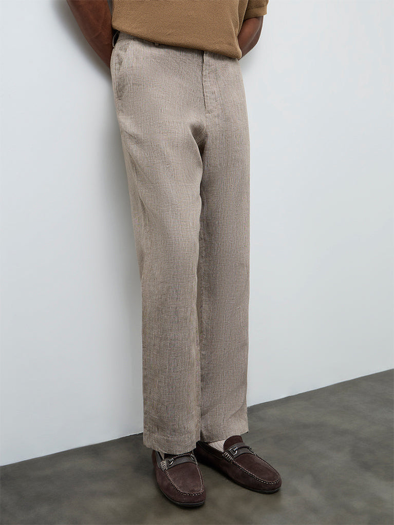 Ascot Taupe Checkered Relaxed-Fit Mid-Rise Linen Trousers