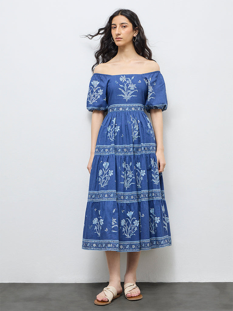 Bombay Paisley presents this blue floral cotton dress shaped in a fit and flare, tiered silhouette. Designed to enhance movement, the layered tiers add volume and fluid drape. A square neckline and short gathered sleeves lend soft structure, while the breathable cotton base brings bohemian charm with an easy, graceful appeal.