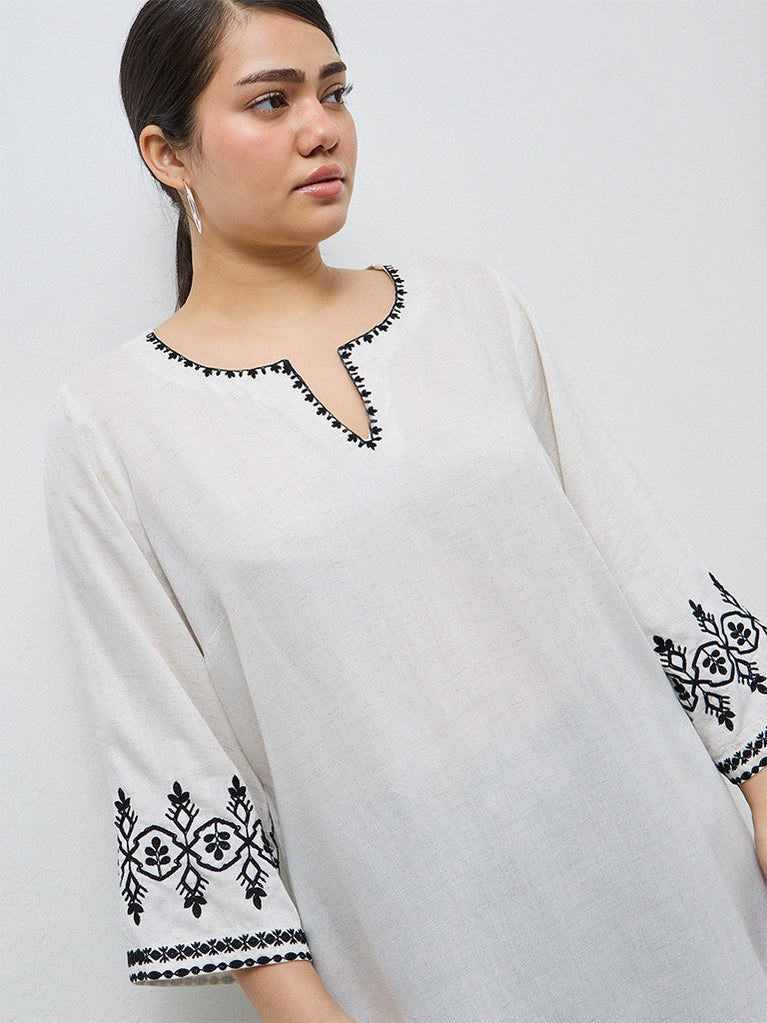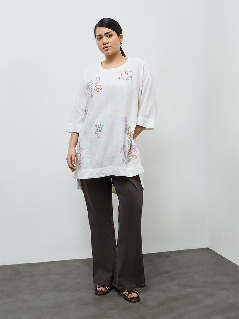 Celebrate effortless elegance with this white tunic from Diza, delicately adorned with floral embroidery for a fresh festive touch. Crafted from a sumptuous blended linen fabric, it features a classic round neck and 3/4th sleeves, while the high-low hemline adds a flattering flow.