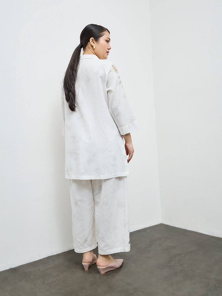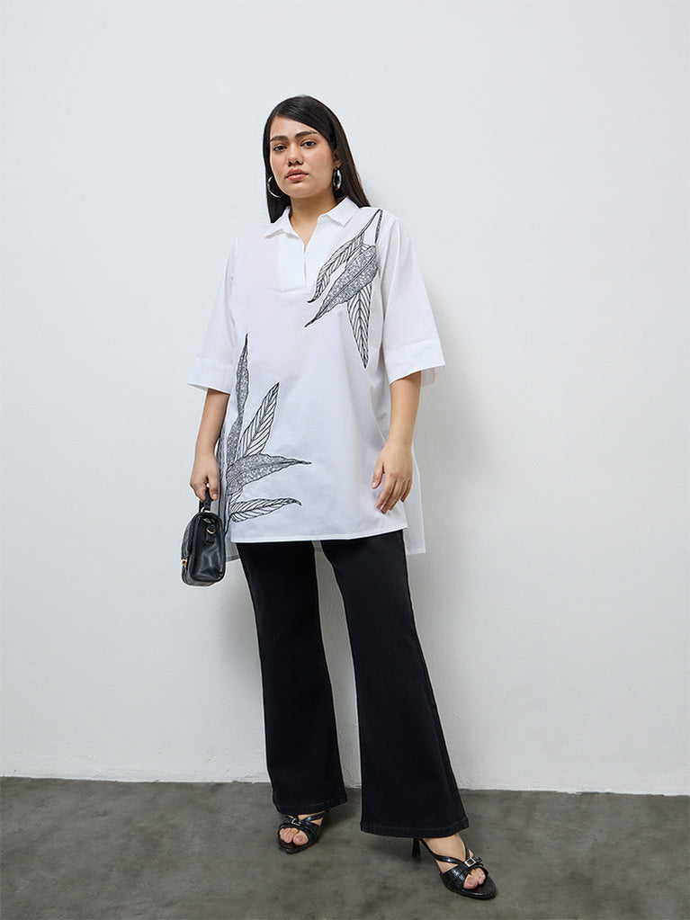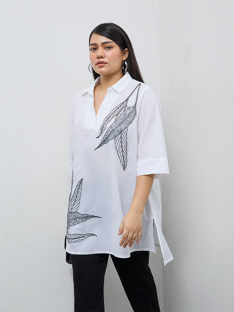Lighten festive dressing with this white tunic from Diza, adorned with delicate leaf embroidery at the front. Spun from pure cotton, it features a subtle high-low silhouette that adds movement and grace. The V-neck collar and three quarter sleeves lend a flattering, airy feel.