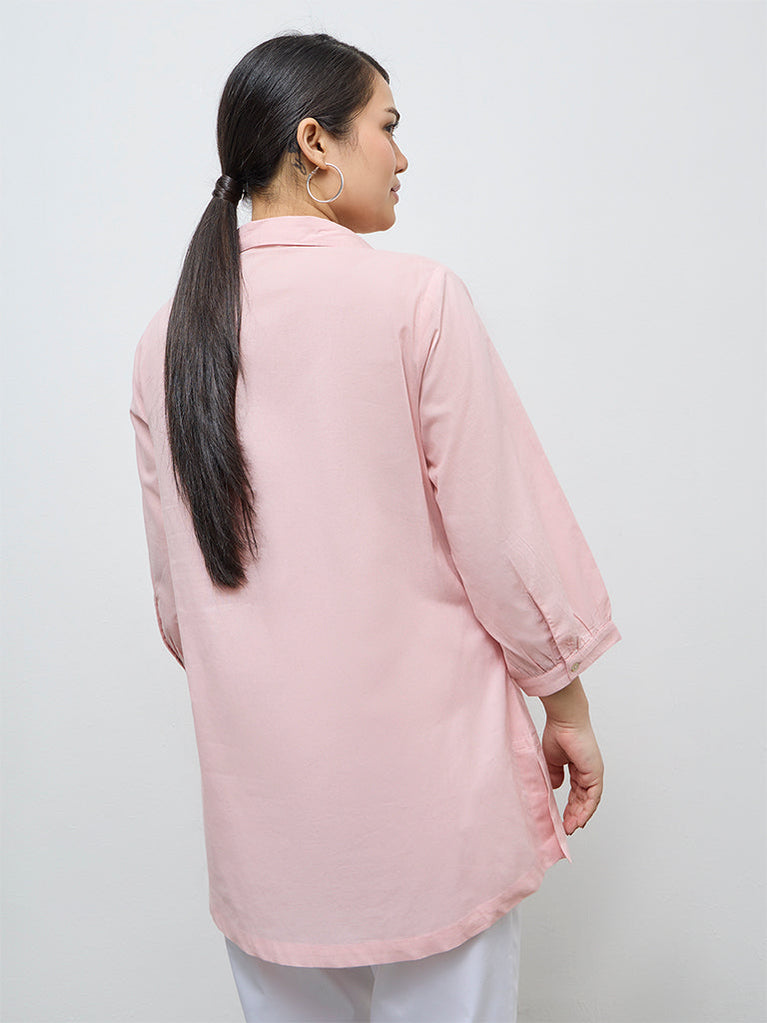 Radiate soft elegance with this pink tunic from Diza, beautifully decorated with botanical embroidery at the front. Crafted from a cotton-rich fabric, it features a collared neckline extending to a button placket and 3/4th sleeves, making it a versatile pick for festive brunches and evening get-togethers.